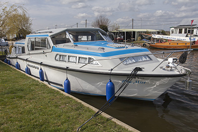 Our lovely cruiser moored at Potter Heigham. | Blue Mist is a low-wash Broads cruiser built on a durable Aquafibre fibreglass hull. The sliding canopy is designed to pass under all Norfolk Broads bridges, though not every day of the year due to varying water levels. Potter Heigham bridge often provides insufficient clearance. The bow thruster and mud-weight winch enable relaxed and comfortable cruising and mooring. A comprehensive induction / familiarisation is provided for all new owners and advice is freely given at any time. |