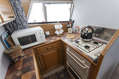 Starboard side. If you choose to cook on board, you'll find everything you need for a full English breakfast to a Sunday roast. |